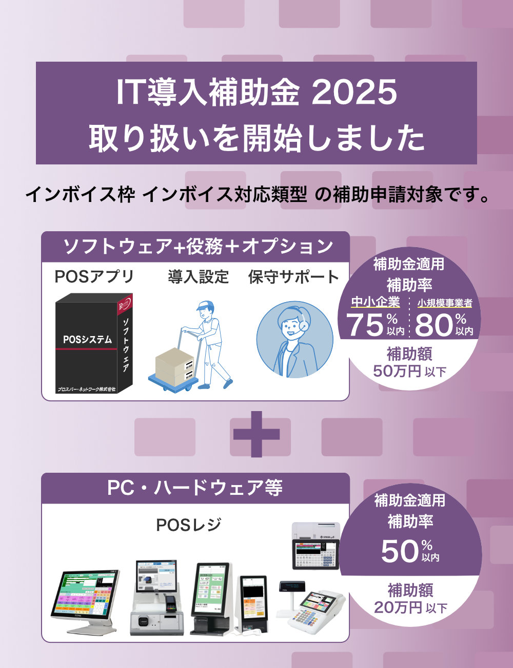 POSアプリ(決済機能ソフトウエア)とPOSレジ を補助金対象製品として登録しています。インボイス枠インボイス対応類型での補助申請になります。