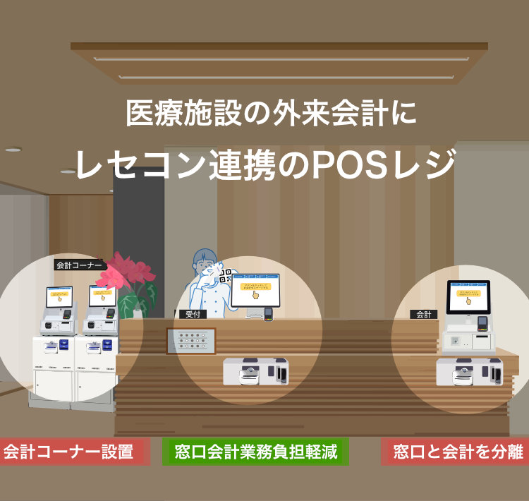セルフレジに対応しています。自動釣り銭機やキャッシュレス端末で構成するセルフレジで、会計をお客様が行います。診療明細もセルフレジが発行するので、窓口業務から会計業務を分けて自動化できます。